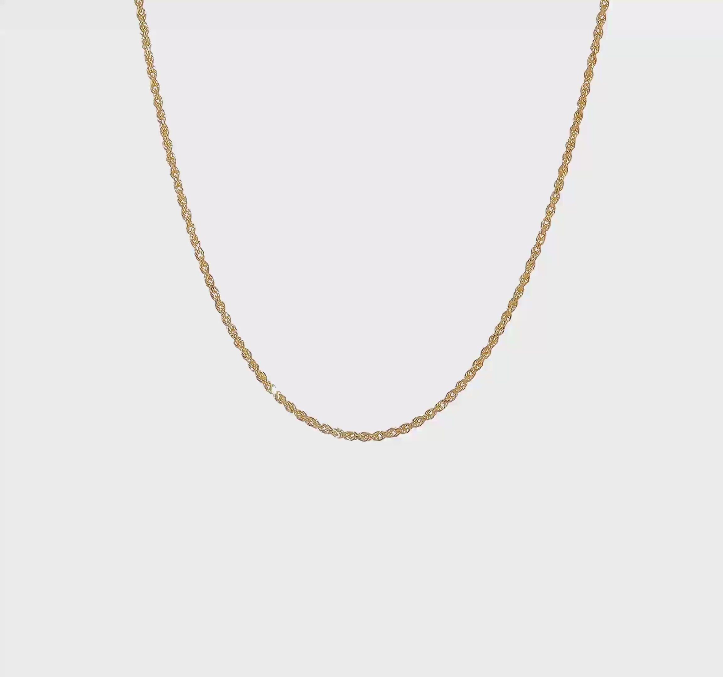 Our 1.5mm Solid Gold Diamond-Cut Rope Necklace is a handcrafted solid gold rope necklace featuring a lobster clasp.