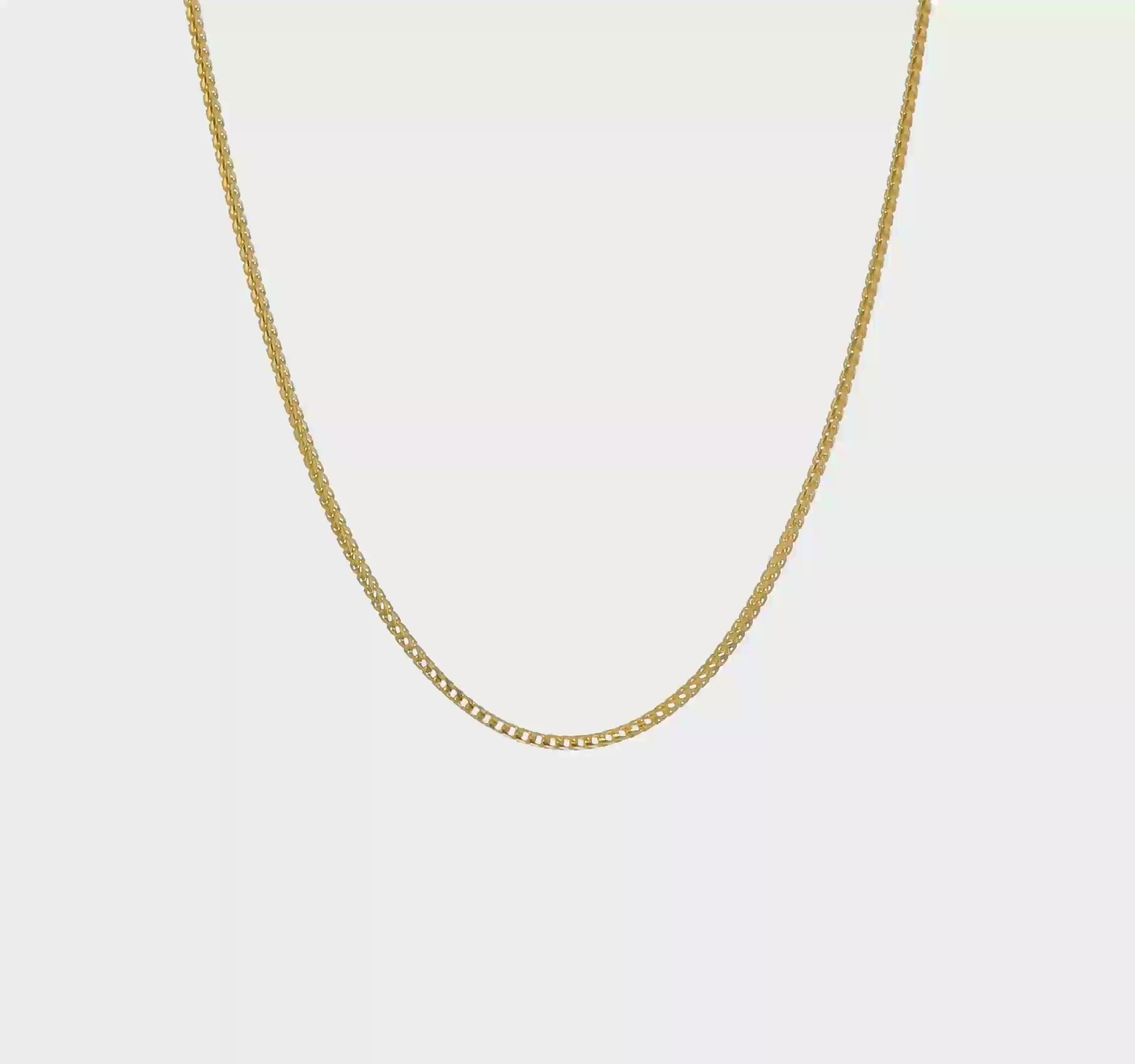 Our 1mm Solid Gold Franco Chain Necklace is a handcrafted Hydrate solid Franco necklace featuring a lobster clasp.